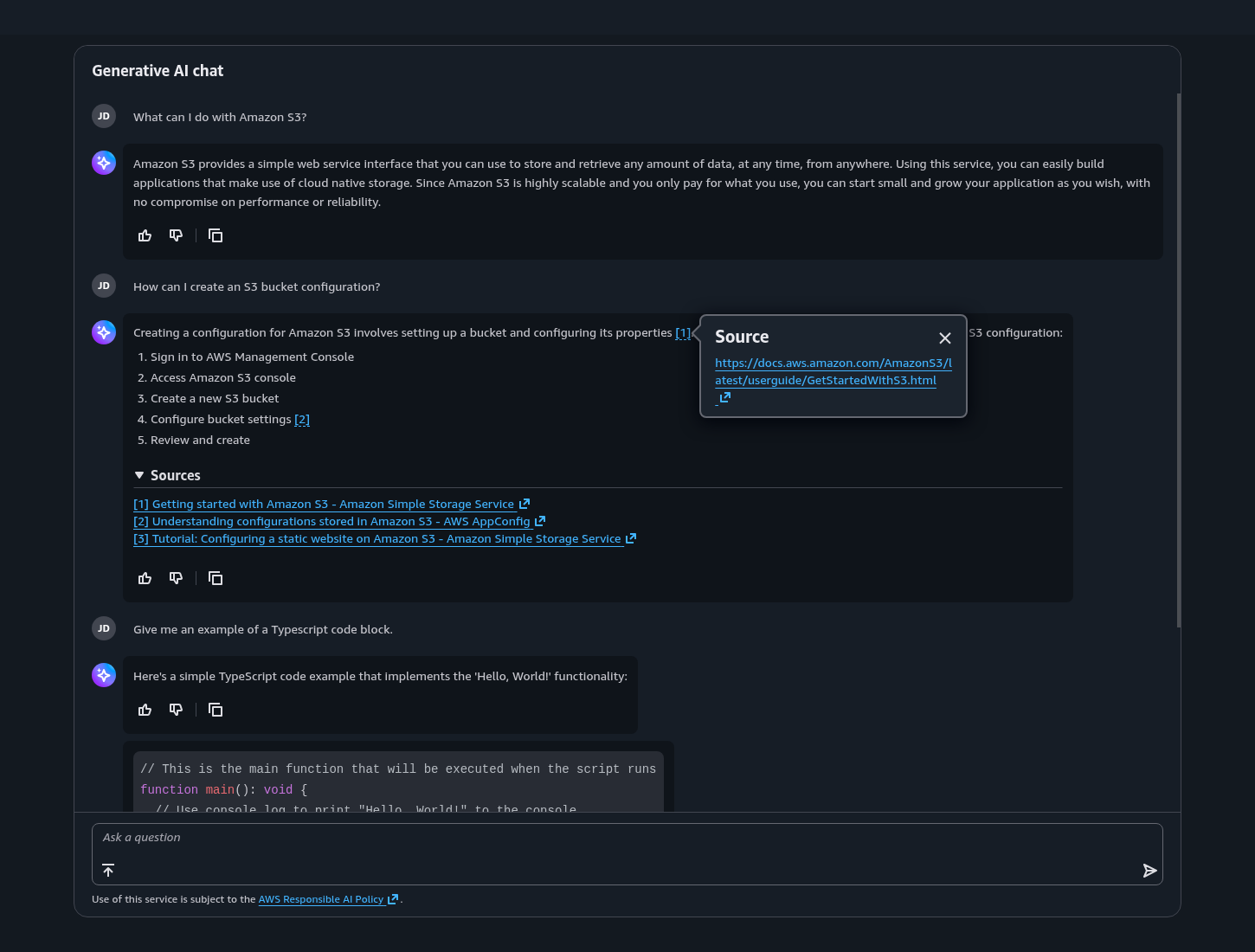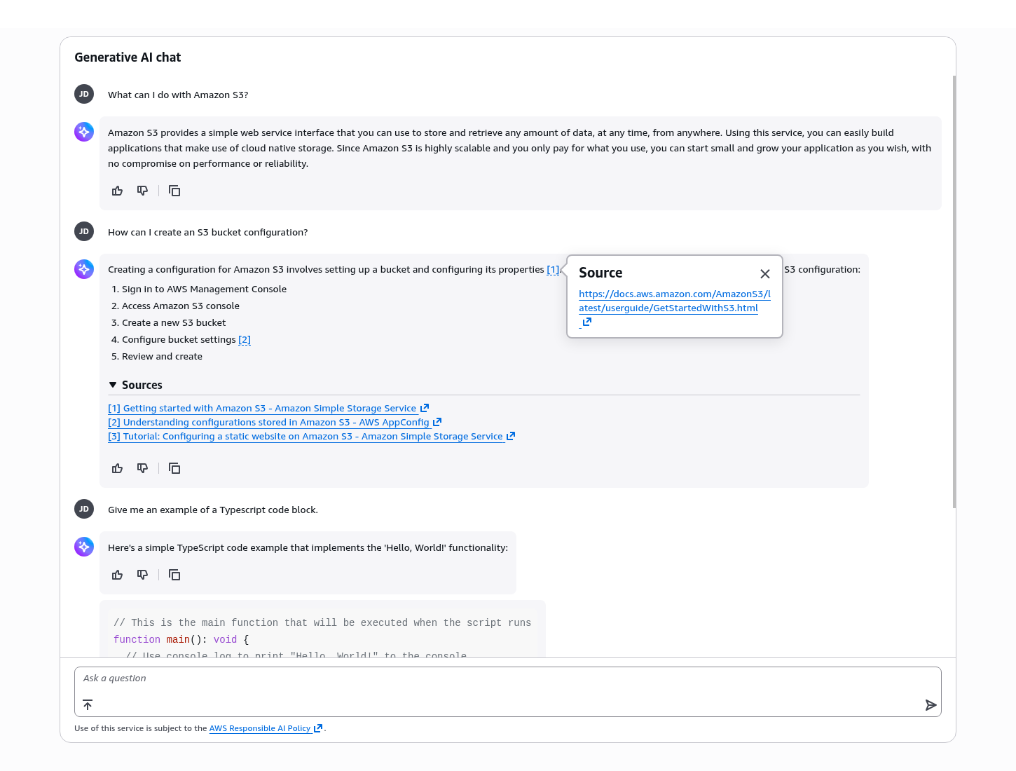 Thumbs up and thumbs down feedback: users can provide feedback on whether the generated response was helpful or unhelpful. Follow the guidelines for feedback on generative AI responses.