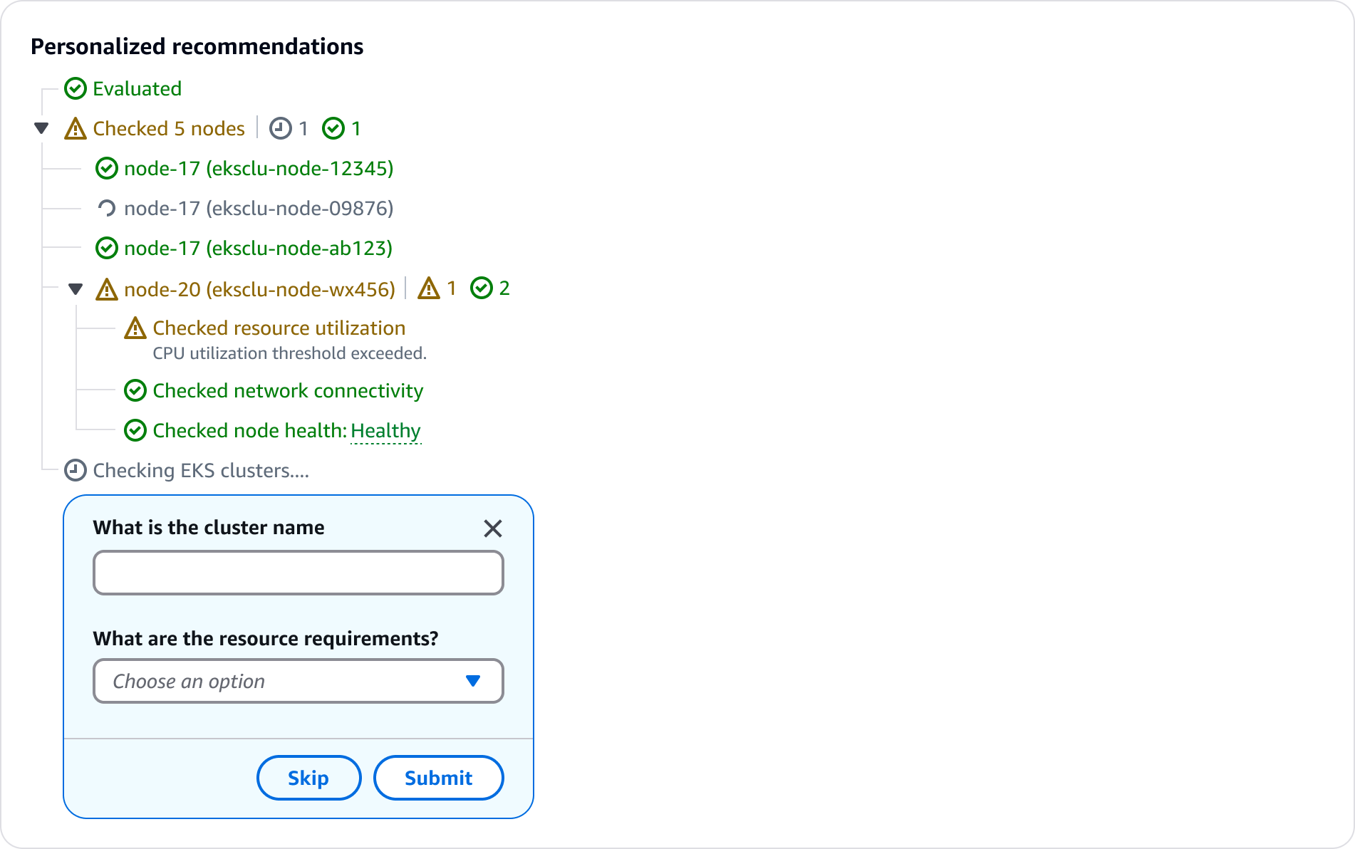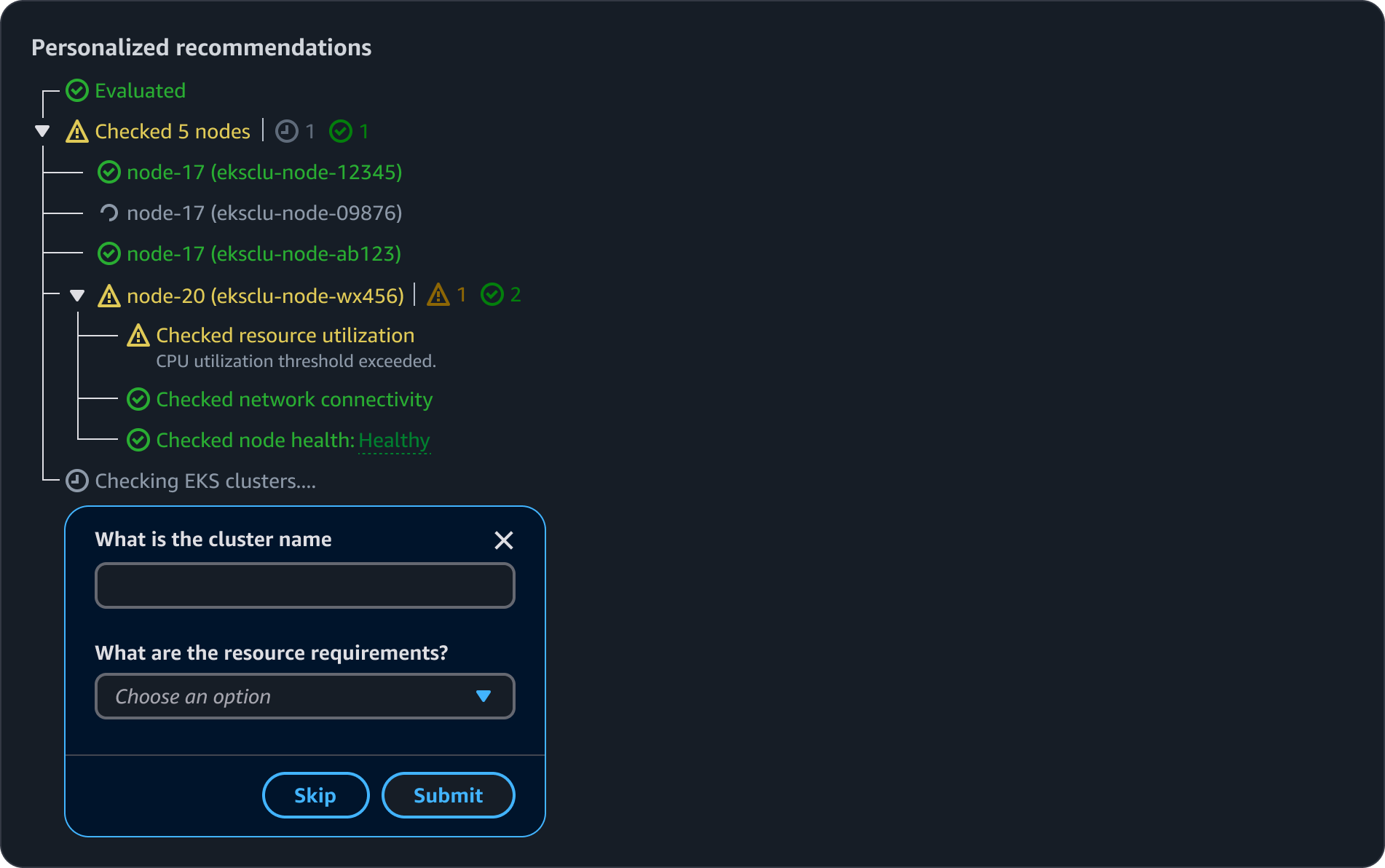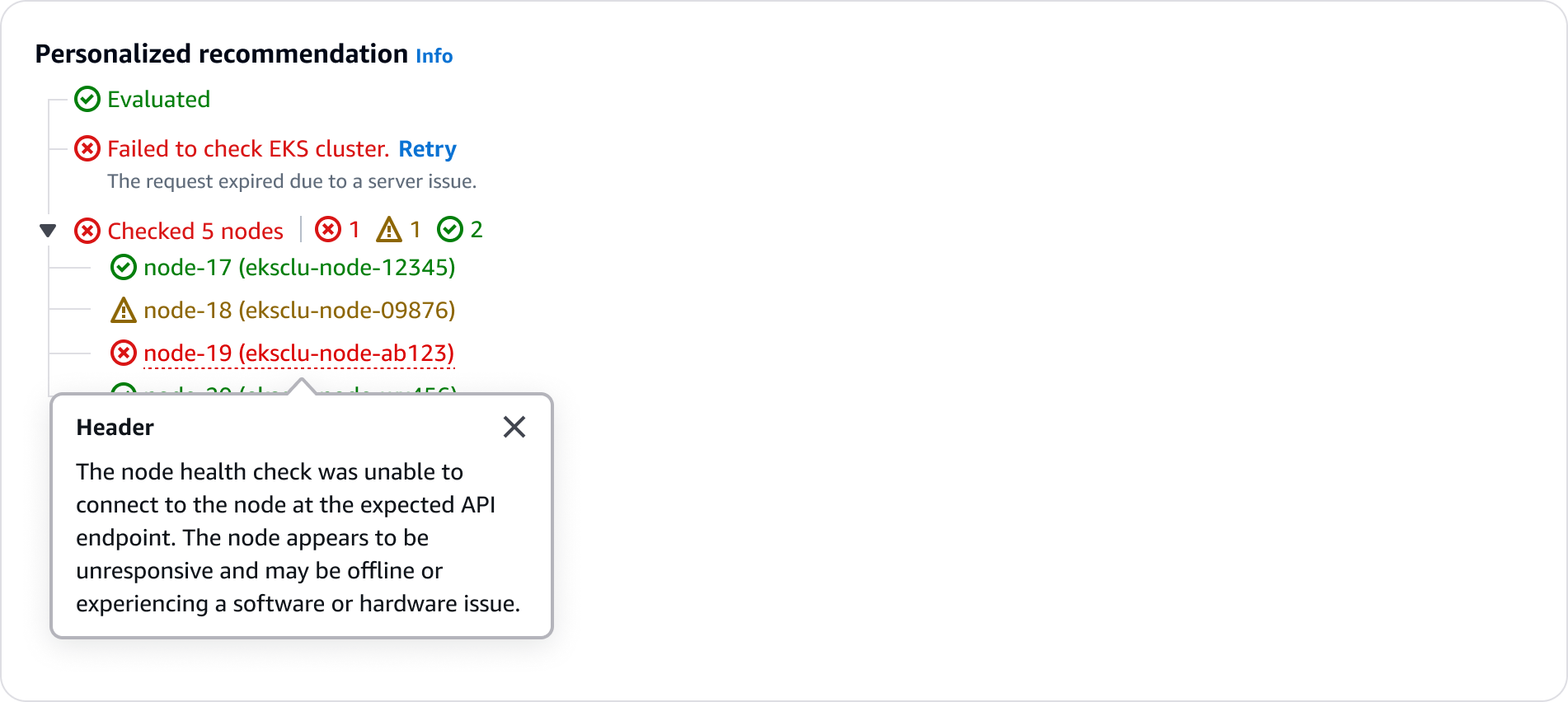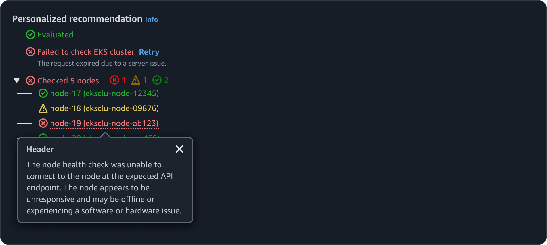 Sub-steps: Display sub-steps with corresponding status to inform users of the overall progress when applicable. For example, display a list of nodes being checked when troubleshooting an EKS issue.