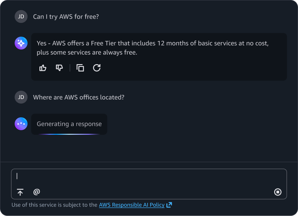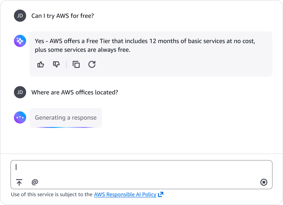 Users can regenerate a completed response to see alternative versions of the same response. The action reuses the original user prompt and context so the conversation stays coherent while exploring new outputs.