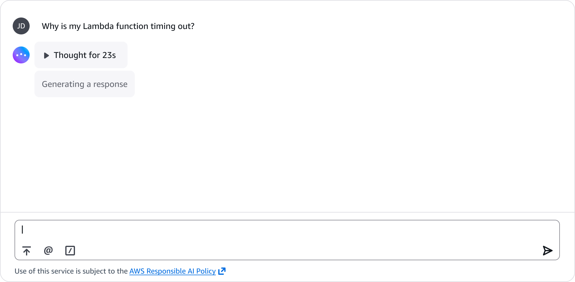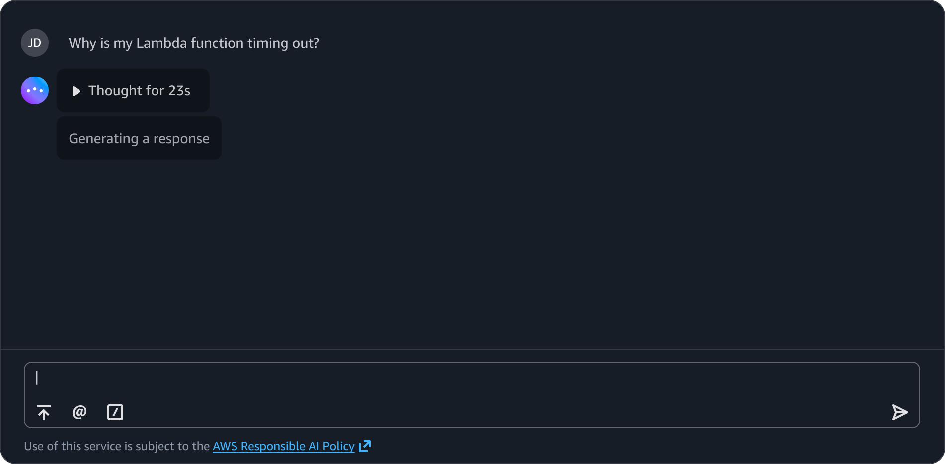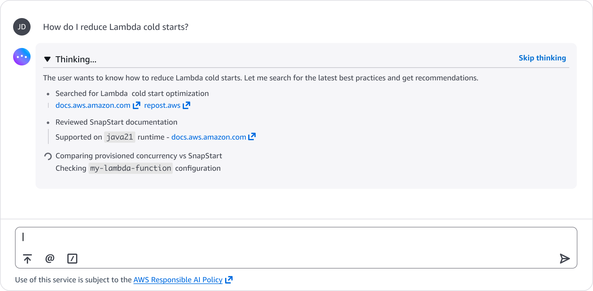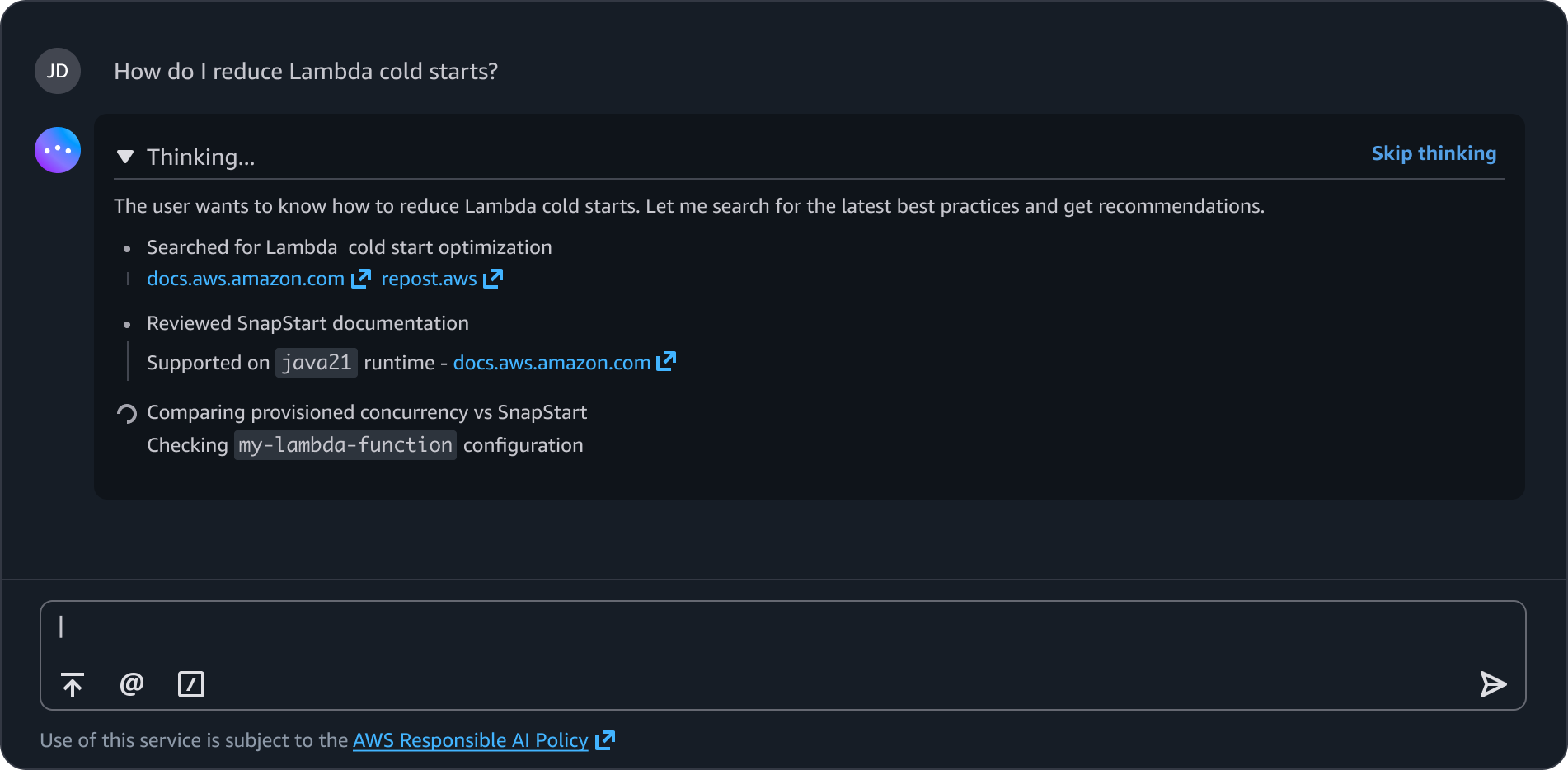 When an agent is deciding how to approach a problem, which service to query, or how to prioritize tasks, surfacing that decision-making process gives users a chance to review the agent's plan before execution begins. For example, before an agent begins diagnosing a Lambda timeout issue, it thinks through whether to suggest memory allocation, VPC configuration, or timeout settings first.