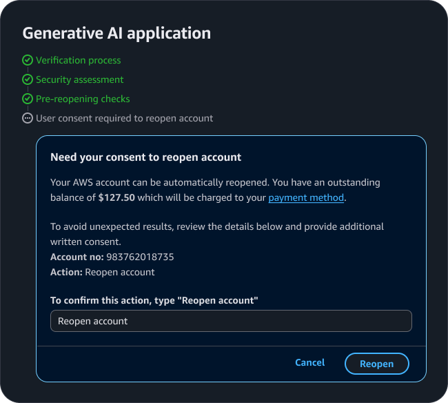 Provide clear options for users to either proceed with the action or decline AI assistance and exit the flow. Button labels should match the intended action. For example, use Delete for deleting an S3 bucket.