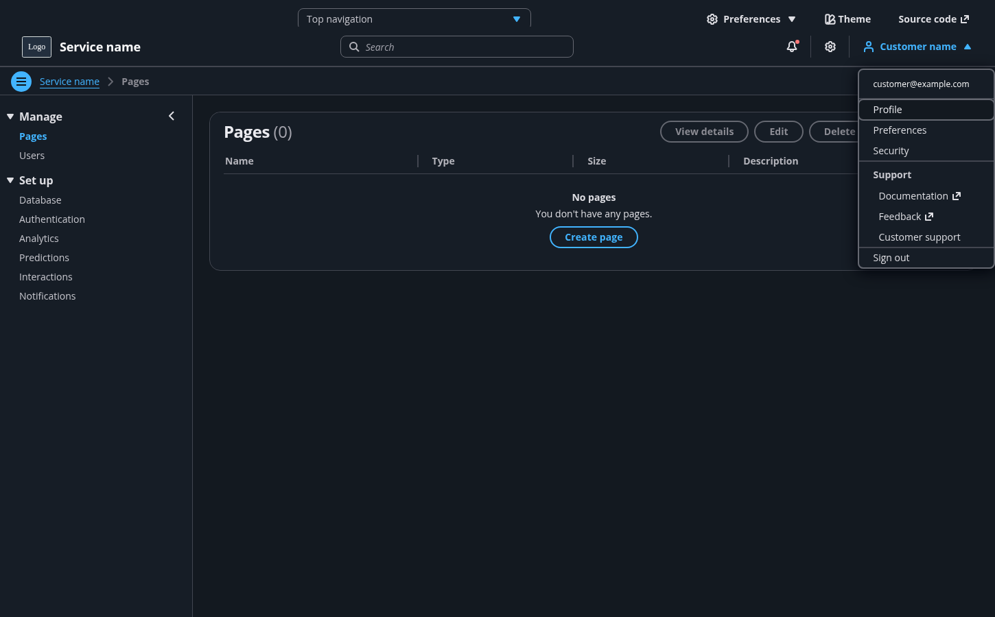 Top navigation provides global controls that help users use the product or service. It’s comprised of a collection of global functionalities that are separate from the product's structural navigation.