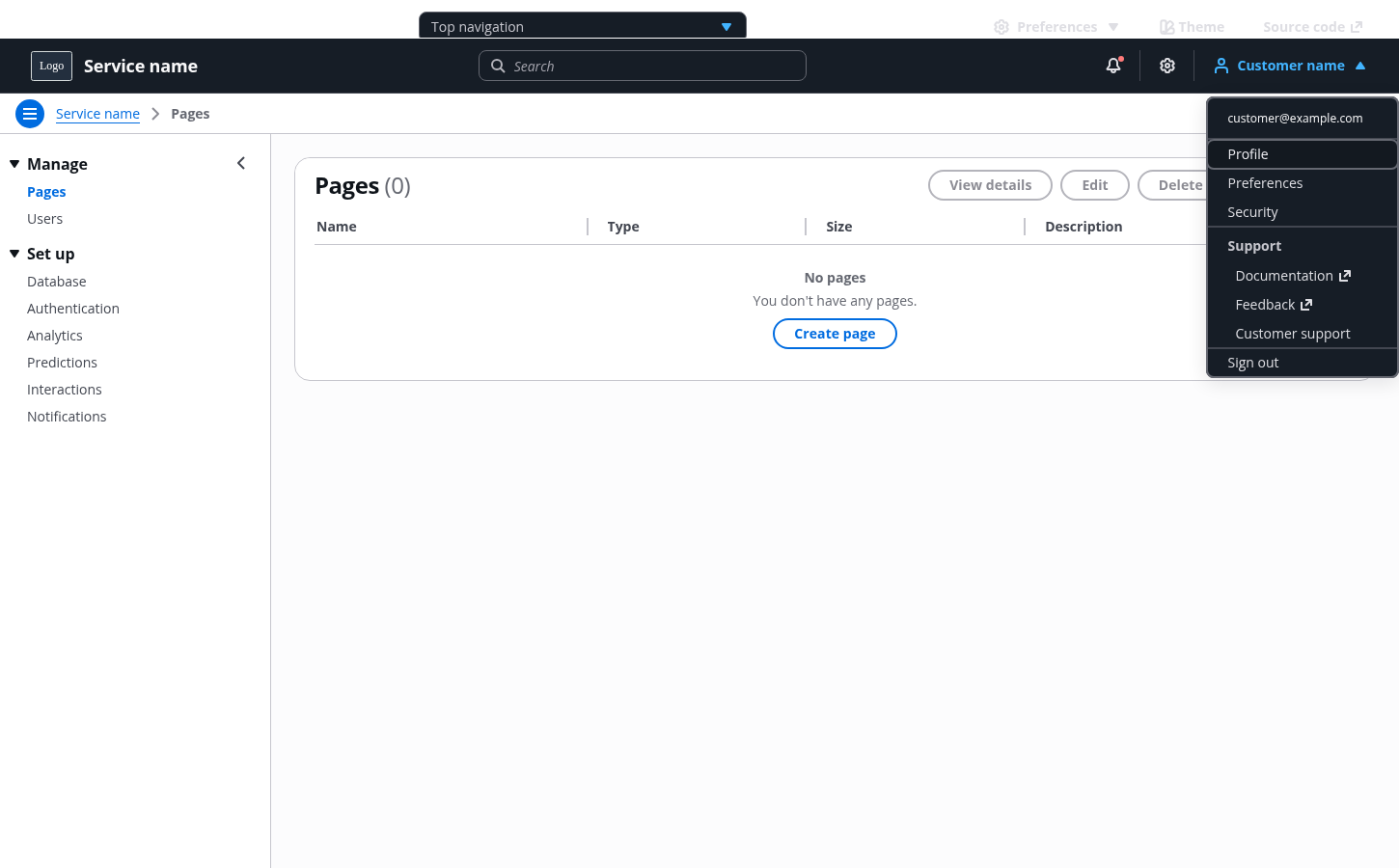 The top navigation should be organized to support the user’s global navigation requirements. It can be used on its own or paired with the side navigation component.