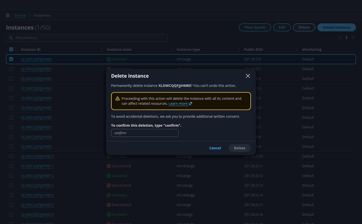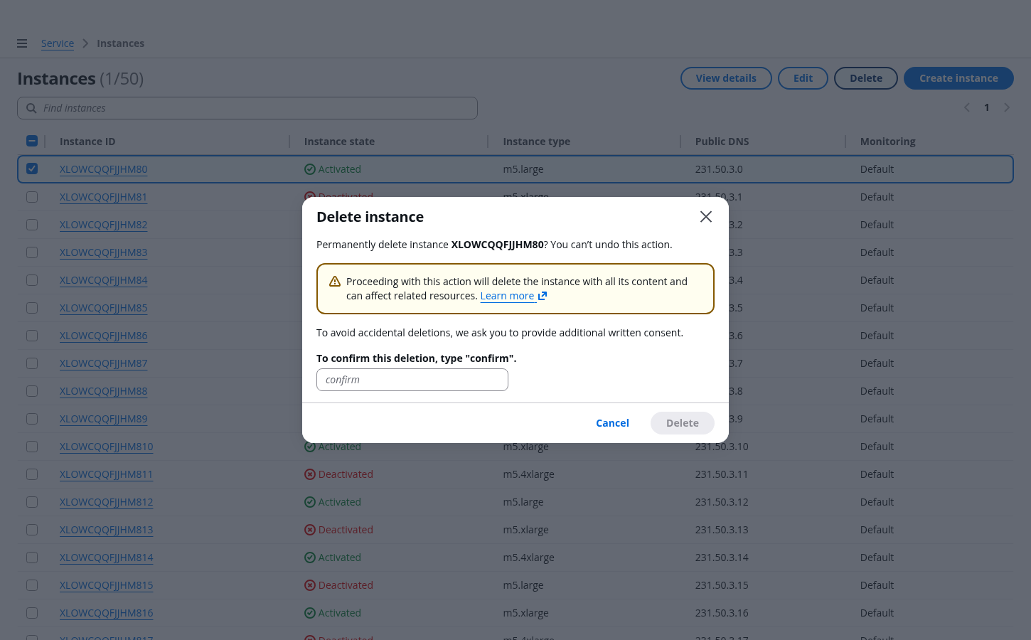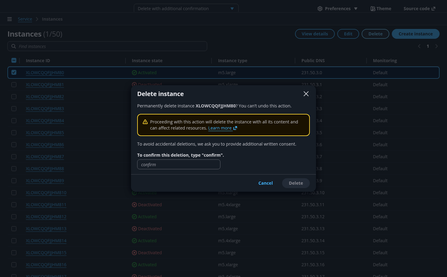 For multiple resources: Delete instances