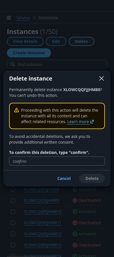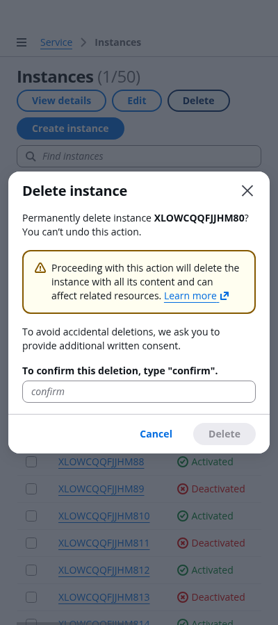 Make sure the user understands everything that is being deleted, and that the action is irreversible. Use important details associated with the resource being deleted, such as the resource name or other unique identifiers. Use bold font weight to expose the resource identifier. For example: Permanently delete instance CMRVMLFVHDVHU0? You can’t undo this action.