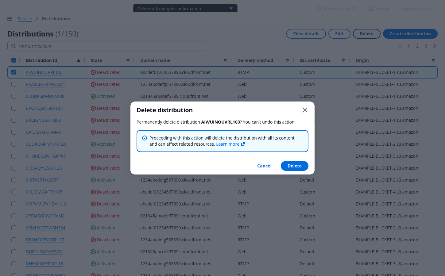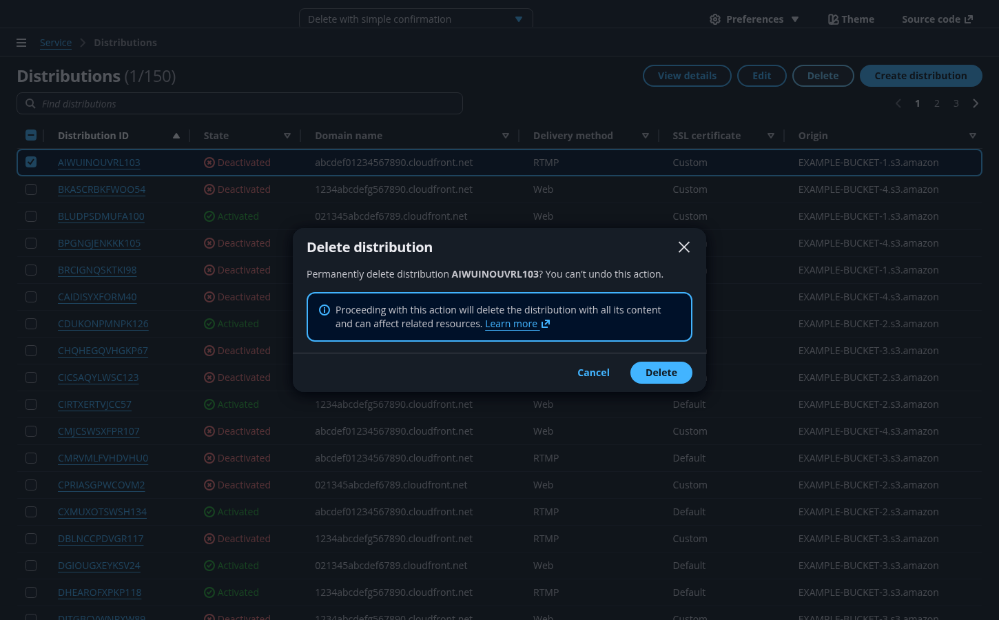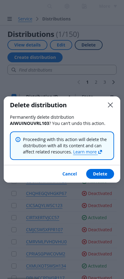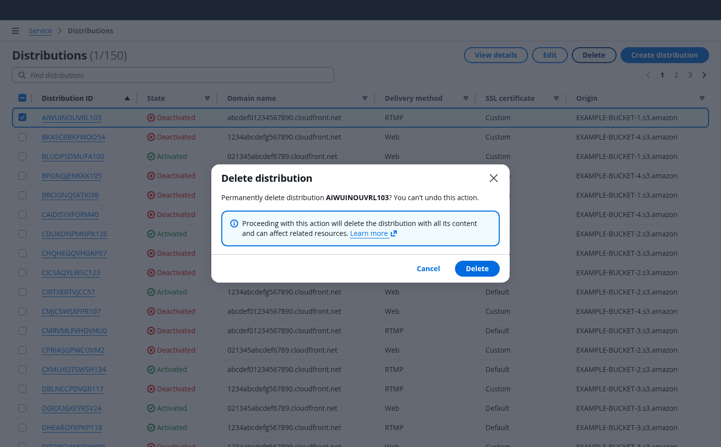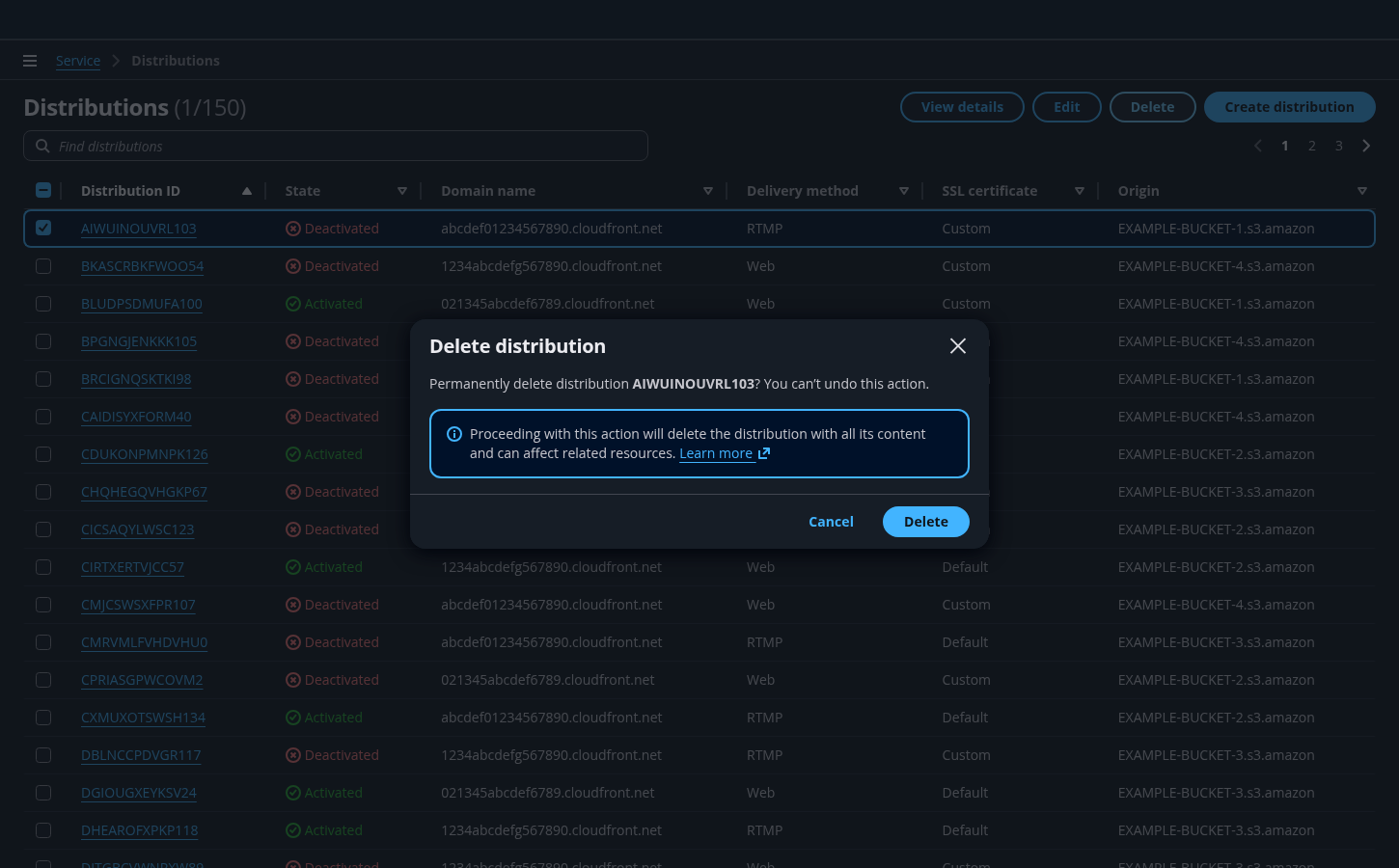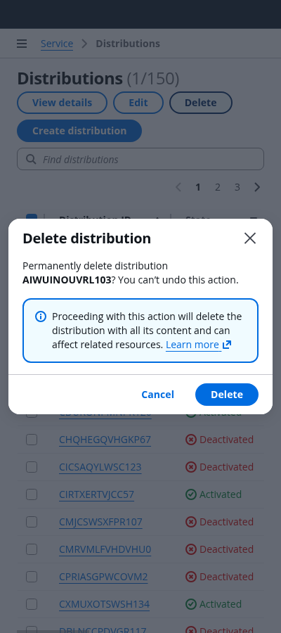 Make sure the user understands everything that is being deleted, and that the action is irreversible. Use important details associated with the resource being deleted, such as the resource name or other unique identifiers. Use bold font weight to expose resource identifier. For example: Permanently delete distribution CMRVMLFVHDVHU0? You can’t undo this action.