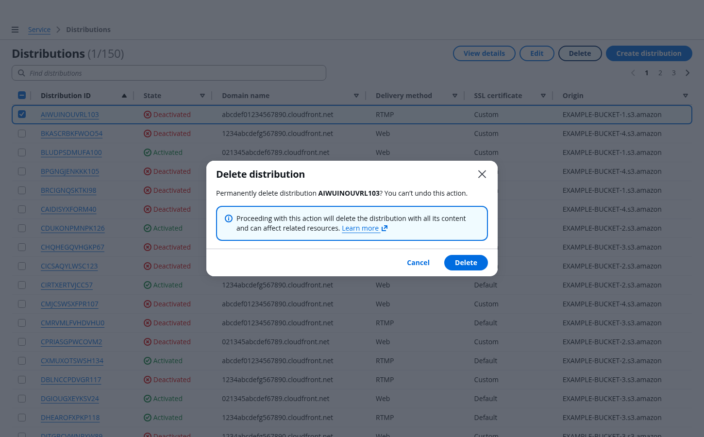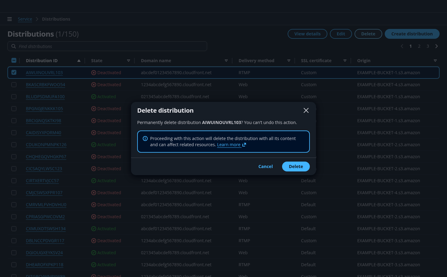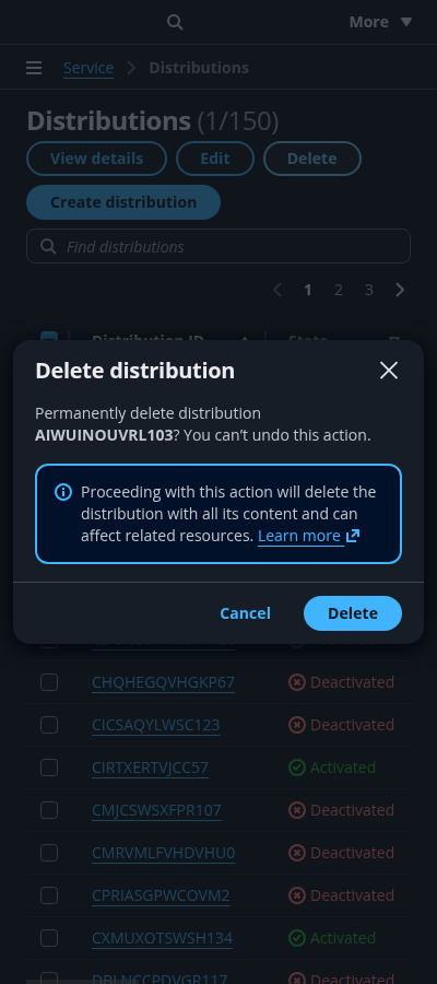 Make sure the user understands everything that is being deleted, and that the action is irreversible. Use important details associated with the resource being deleted, such as the resource name or other unique identifiers. Use bold font weight to expose resource identifier. For example: Permanently delete distribution CMRVMLFVHDVHU0? You can’t undo this action.
